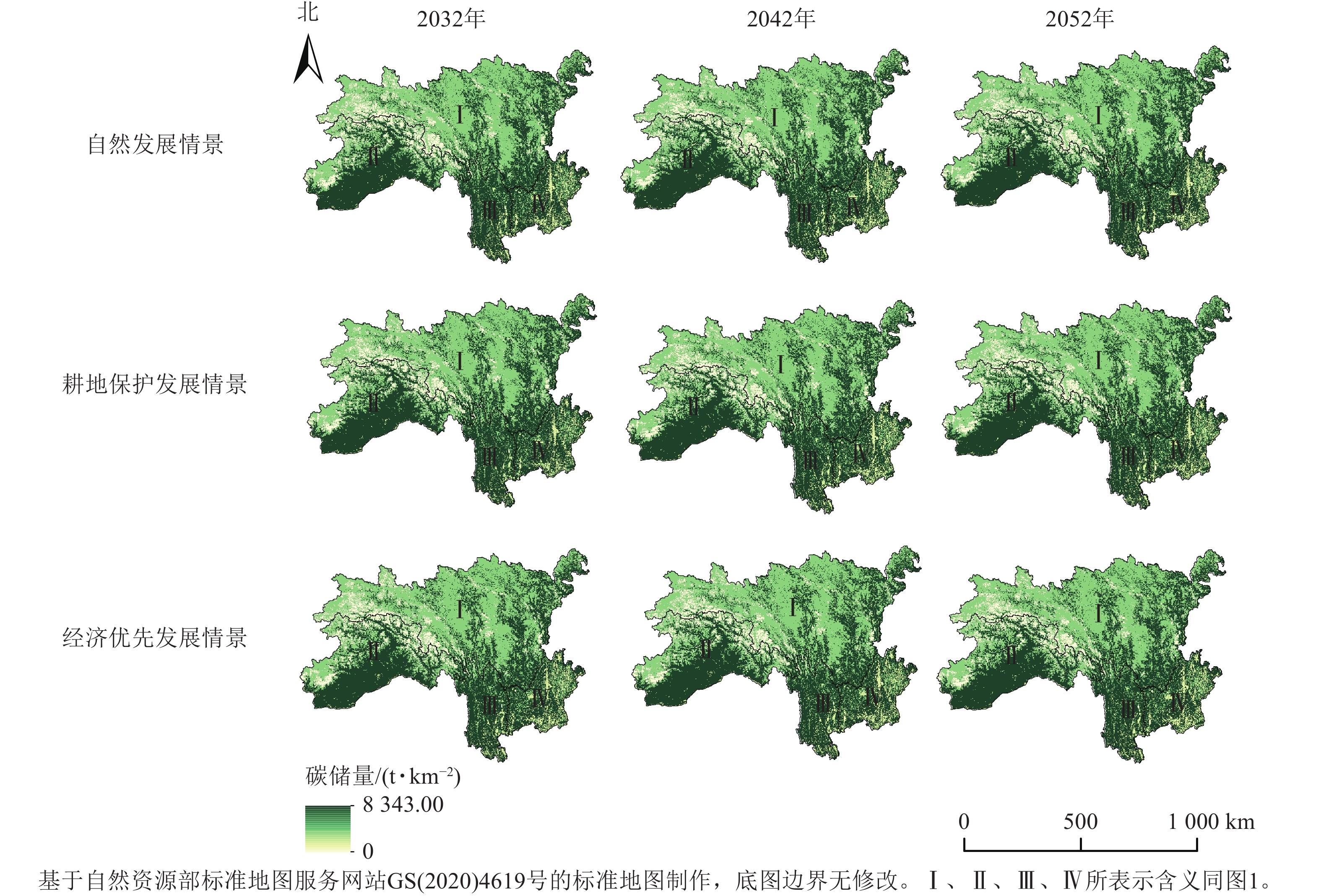 • 在3种情景下,西南高山峡谷区2032—2052年碳储量平均值都高于2022年(图7)。自然发展情景下碳储量平均值大于5 292.41 t·km−2,并呈逐年增加趋势。耕地保护发展情景下碳储量平均值大于5 317.66 t·km−2,呈先降低后增加的趋势。经济优先发展情景下碳储量平均值少量增加,大于5 339.35 t·km−2,呈逐渐降低的趋势。从整体上看,研究区碳储量高值集中在林地较多的Ⅱ区和Ⅲ区,Ⅰ区主要为草地,碳储量低于以林地为主的其他区域,Ⅳ区虽然林地占比高于其他土地利用类型,但受区域内建设用地和未利用地的影响,碳储量低于Ⅱ区和Ⅲ区。