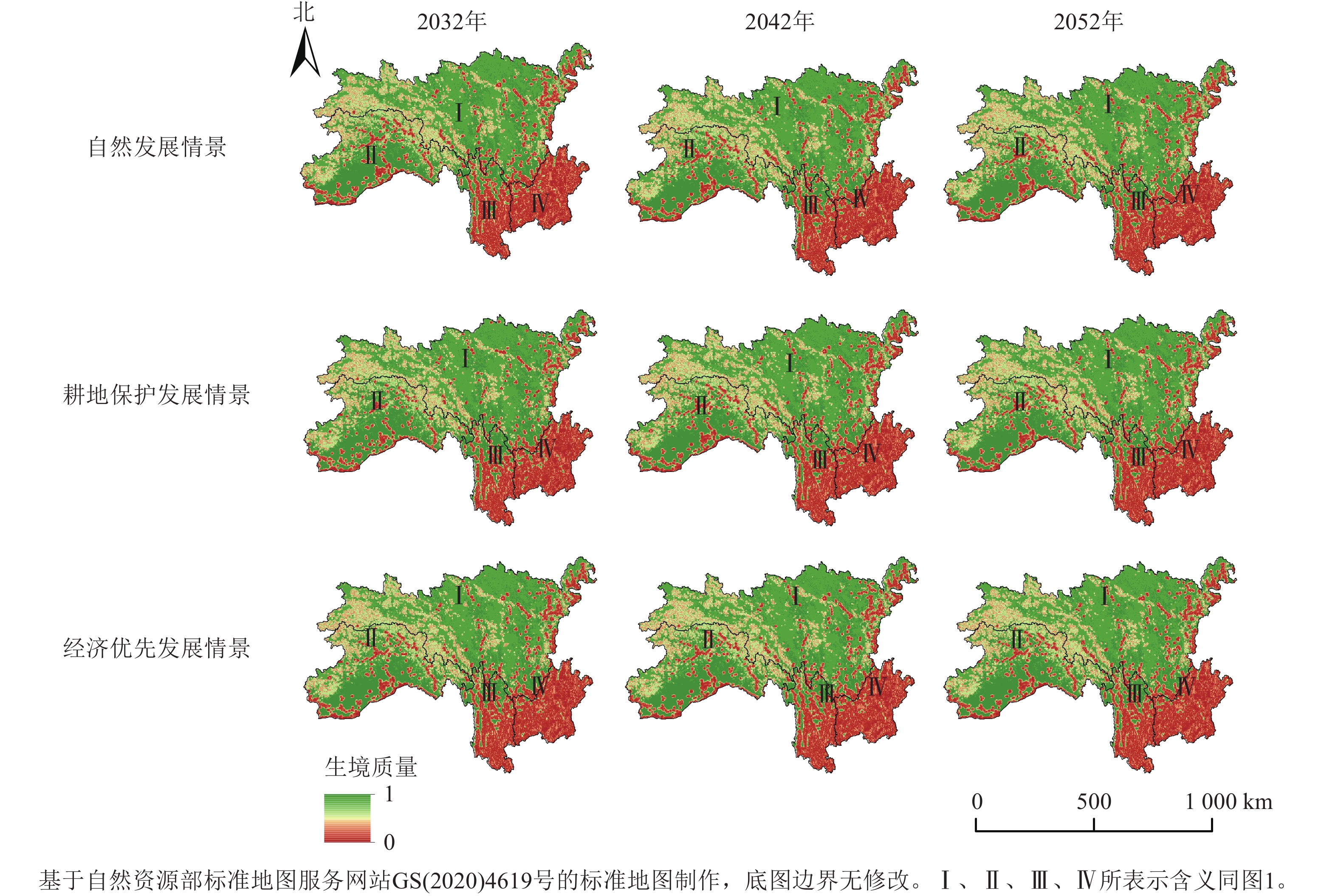 2032—2052年自然发展情景下西南高山峡谷区产水量逐渐增加,高值集中在Ⅲ区和Ⅳ区,碳储量逐渐增加,土壤保持量平均值先减少后增加;耕地保护发展情景在一定程度上保护了农业生产,区域内产水量先减少后增加,碳储量少量增加,土壤保持量平均值逐渐降低;经济优先情景以经济增长为主,忽视资源与环境的保护,在这样的发展情景下,区域内产水量大幅度减少、碳储量少量增加、土壤保持量大幅度减少。3种发展情境下生境质量平均值为0.60左右,期间变化较小,但总体好于2022年。