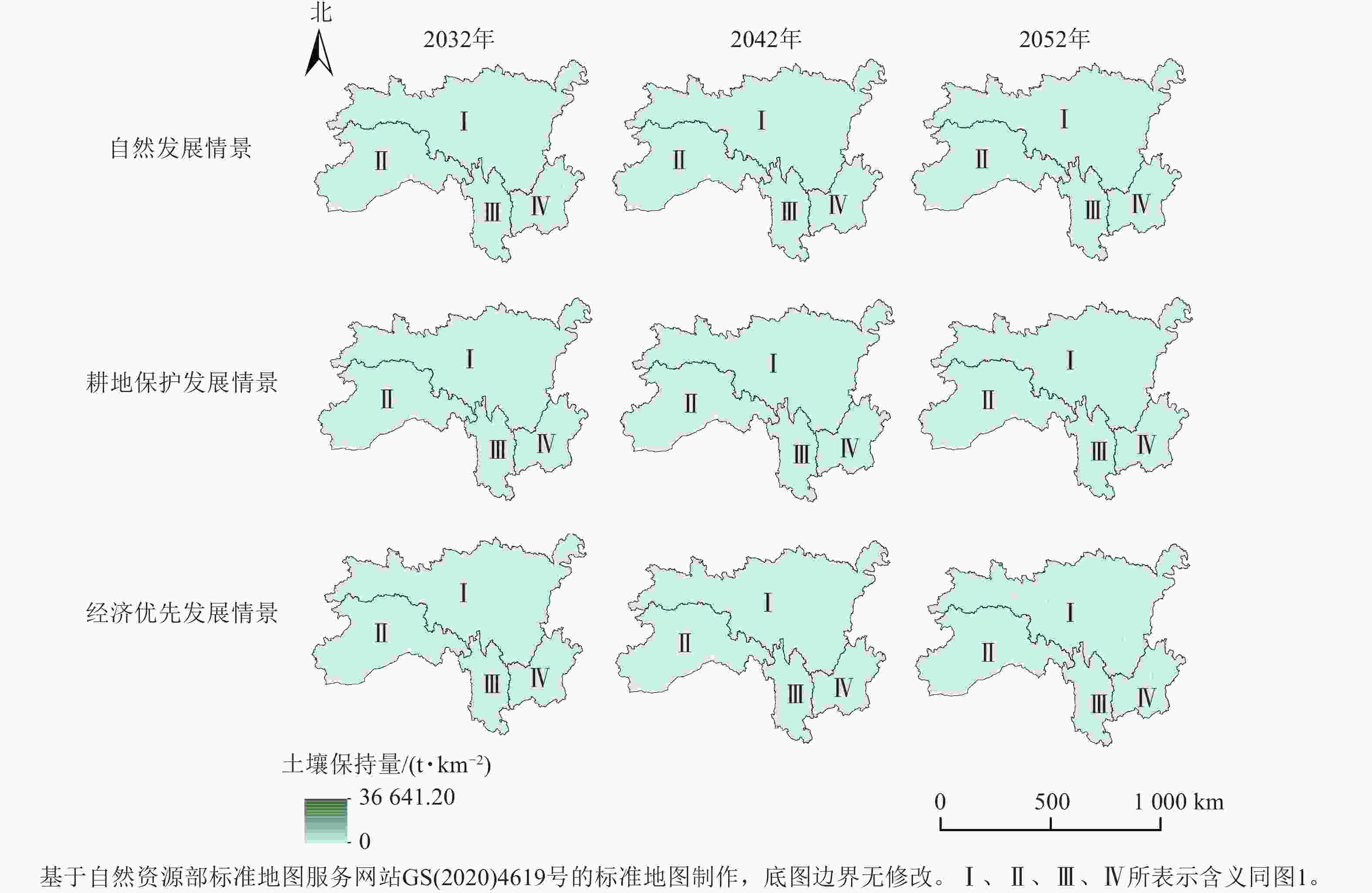 • 在3种情境下,西南高山峡谷区2032—2052年土壤保持量平均值都高于2022年(图9)。自然发展情景下土壤保持量平均值从2032年的81.58 t·km−2增加至2052年的174.30 t·km−2,前期土壤保持量增加较为平缓。耕地保护发展情景下土壤保持量平均值从2032年的256.09 t·km−2降低至2052年的160.18 t·km−2。经济优先发展情景下土壤保持量平均值从2032年的246.42 t·km−2降低至2052年的60.49 t·km−2,在2042年后逐渐平缓。从空间上看,研究区土壤保持情况较好,但有极端较差情况。土壤保持量最大值分布在Ⅰ区东南部、Ⅲ区西部和南部、Ⅳ区南部,这些地区主要受建设用地和未利用地的影响,土壤保持量高于其他地方。