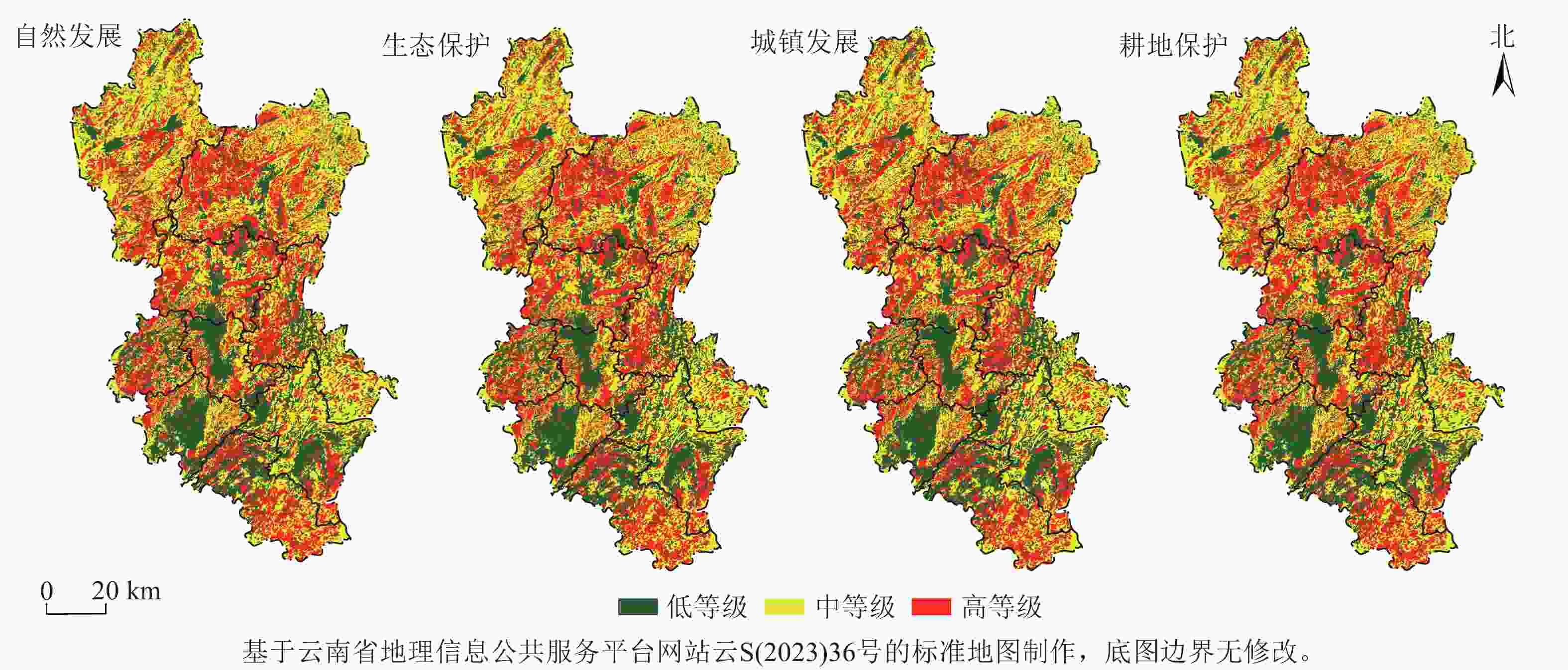 • 表6图4可知:曲靖市2040年自然发展、生态保护、城镇发展、耕地保护情景的平均生境质量分别为0.678、0.679、0.672和0.678,从高到低依次为:生态保护、耕地保护、自然发展、城镇发展。具体表现为:①自然发展的低中高生境质量面积分别为7 500.121、 11477.810 及9 938.301 km2,相较2020年分别增加167.705 km2、减小167.149 km2及0.557 km2。其中,低等级面积增加2.287%,主要由中等级转化。整体上看,曲沾坝、陆良坝及宣威坝生境质量进一步下降,是因为坝区既是农业活动集中区,又是城镇扩张的主要空间。曲靖作为滇中城市群的重要城市及省级副中心城市,未来仍需要大量耕地转化为城镇建设用地,以促进区域社会经济发展。②相较自然发展,生态保护的生境质量低等级面积占比增加较小。低中高生境质量面积分别为7 512.028、11 417.694、9 986.51 km2,相较2020年分别增加179.612 km2、减小227.265 km2及增加47.653 km2。整体上水域生境质量有明显提高,但研究区为喀斯特区,水域面积扩张受限,生境质量提高相对有限。③与自然情景相比,城镇发展的生境质量低等级面积占比明显增加,主要位于曲沾坝和陆良坝边缘地区。低中高生境质量面积分别为7 735.078、11 269.124、9 912.030 km2,相较2020年分别增加402.662 km2、减小375.835 km2及26.827 km2。其中,低等级面积增加了5.492%。④相较自然发展,耕地保护的生境质量低等级面积占比增加较大。低中高生境质量面积分别为7 551.210、11 478.007及9 887.015 km2,相较2020年分别增加218.794 km2、减小166.952 km2及51.834 km2。整体上看,与2020年相比,2040年4种情景下的曲靖市生境质量水平均呈现下降趋势。从空间分布看,2040年4种情景下曲靖市生境质量整体呈“北高南低”的分异规律,生境质量低值区与曲靖的坝子空间分布高度一致。