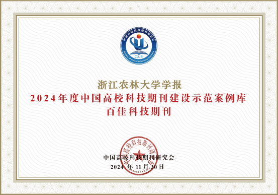 2024年12月3日,中国高校科技期刊研究会发布了2024年度中国高校科技期刊建设示范案例库·杰出/百佳/优秀科技期刊案例名单,《浙江农林大学学报》被评为中国高校科技期刊建设示范案例库·百佳科技期刊。